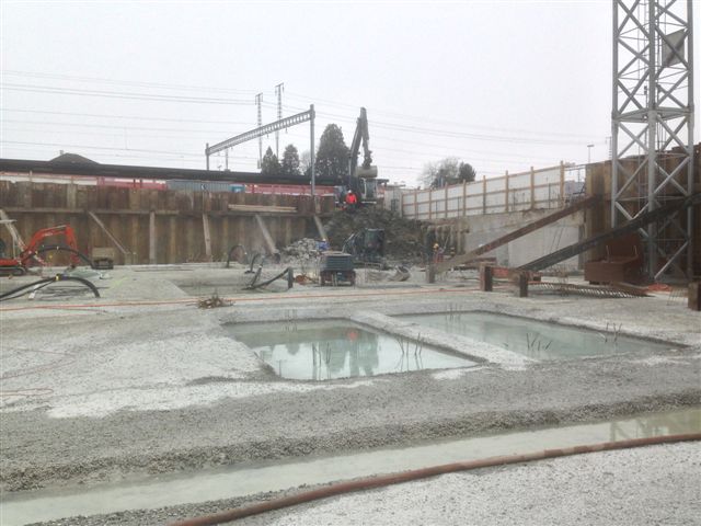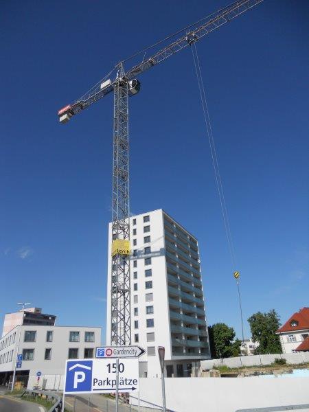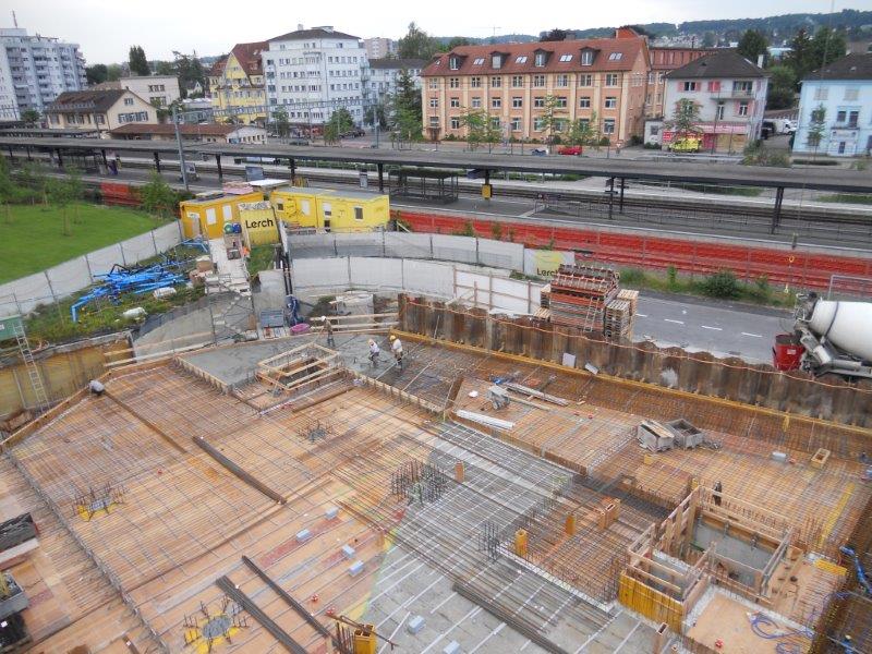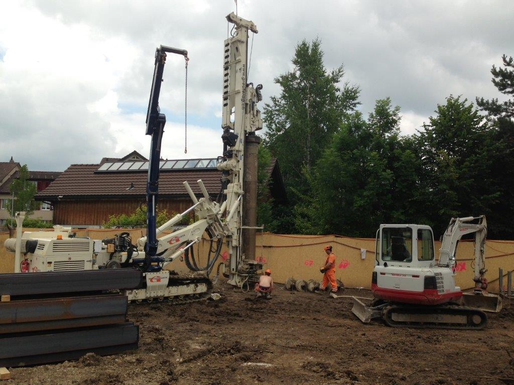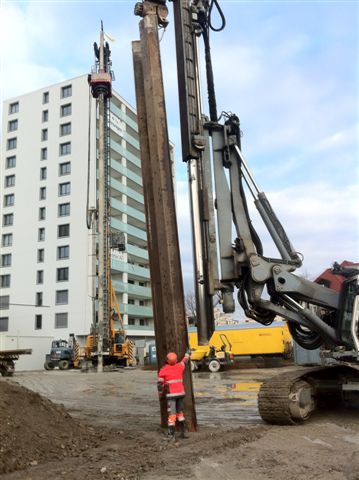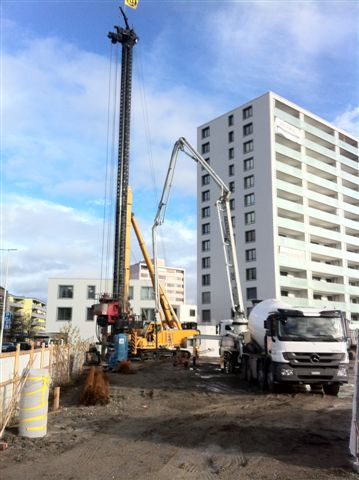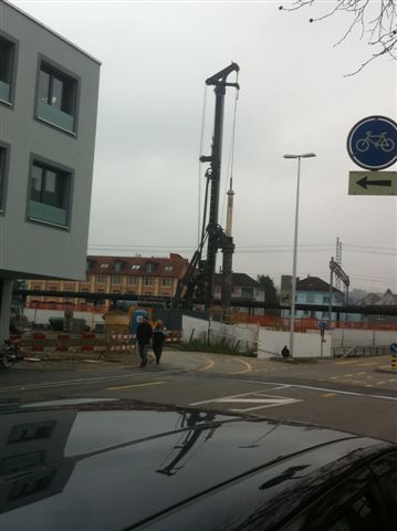 Hier sehen sie ein 44.50 m hohe Spezial-Pfählungsmaschine im vollen Einsatz. Das gesamte Gebäude musste auf Pfählen fundiert werden, da der Bodensee sehr nahe liegt.