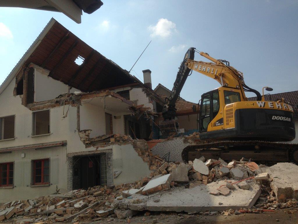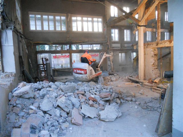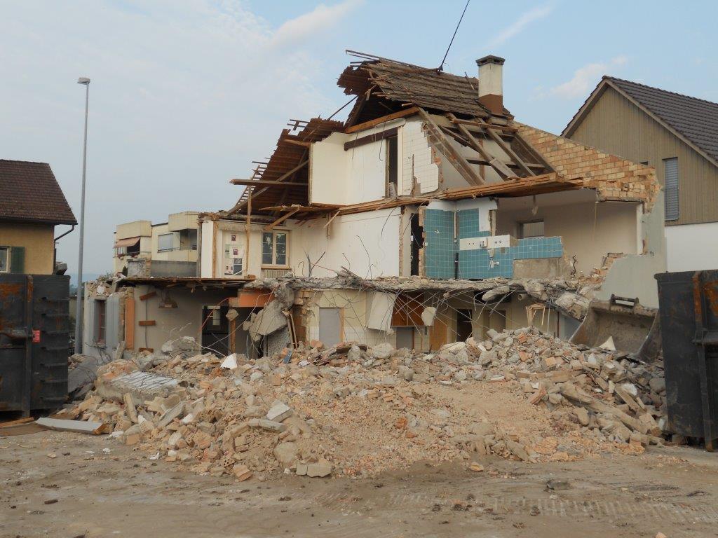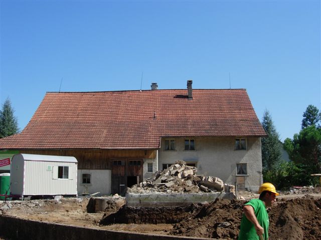 - Zeile2 Beschreibung: Muldenweise wurde Altholz, Alteisen und Bauschutt ausgebaut und abgeführt. Das Gebäude wurde durch den Zimmermann abgestützt respektive neu aufgestellt. Somit konnte das komplette Gebäude ausgehölt werden.