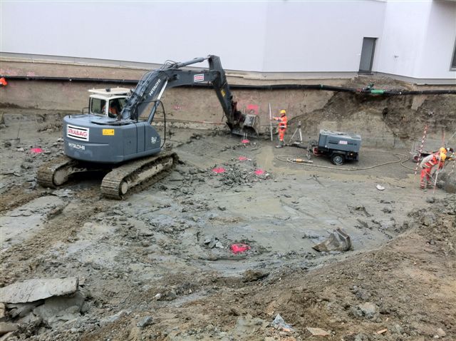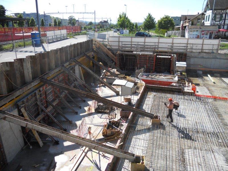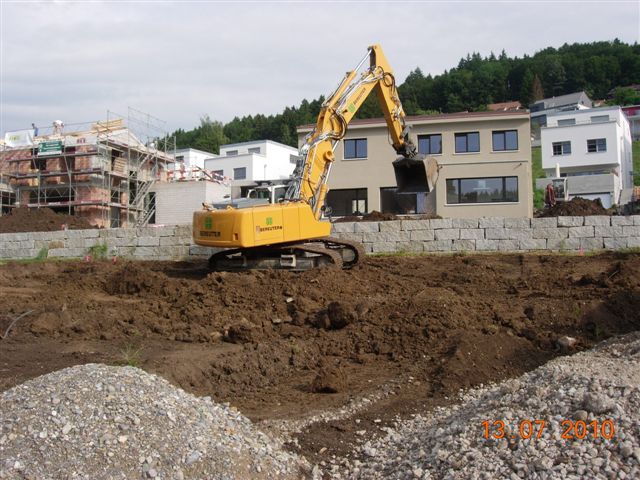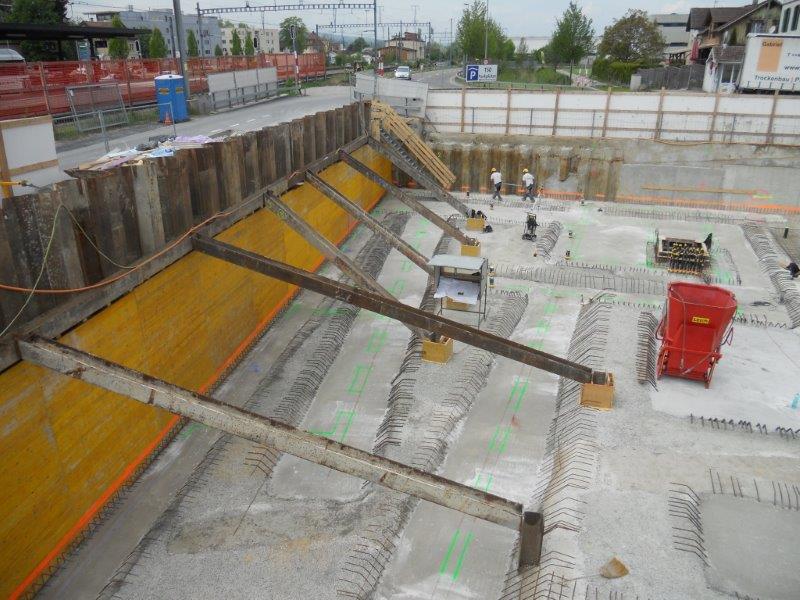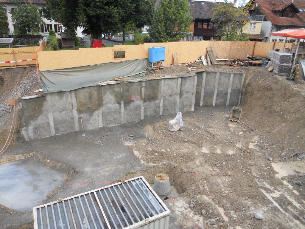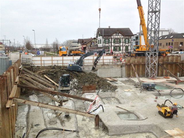 Die Aushubarbeiten sind in vollem Gange. Auf der rechten Seite zeigt sich die aufwendige und zeitintensive Unterfangungsarbeit.