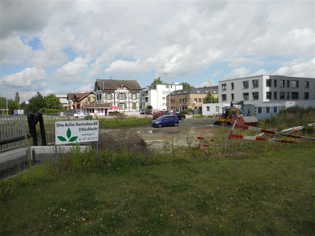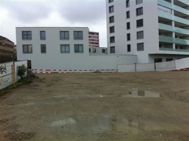 - Zeile1 Beschreibung: So präsentierte sich die zu überbauende Baulandparzelle im Mai 2010. 14 Monate später stand das moderne Mehrfamilienhaus.