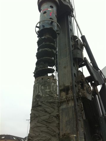18 Ortbetonpfähle und 89 Ortbeton-Verdrängungs-Pfähle mussten gebohrt werden damit das Gebäude danach auf einem echten Fundament zu stehen kommt.