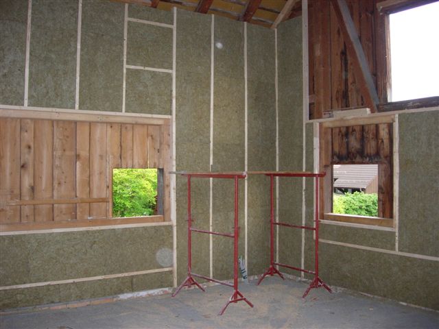 Im OG erstellten wir als erstes die Dämmung auf die Tragkonstruktion des Hause und mauerten dann die Wände für die Betondecke über dem Obergeschoss.