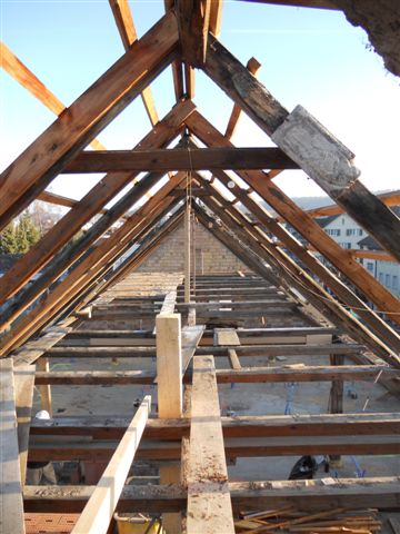 - Zeile3 Beschreibung: Der alte Dachstuhl wurde durch die gesamte Bauphase gesichert und abgestützt. Maurer und Zimmermann mussten im wahrsten Sinn des Wortes auf höchstem Niveau miteinander zusammenarbeiten.