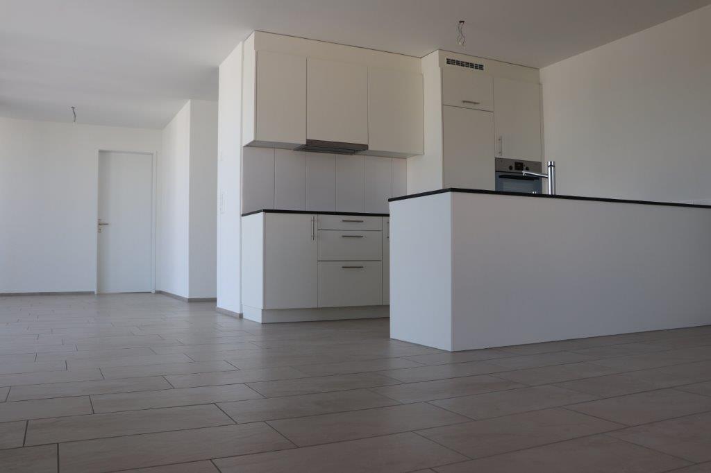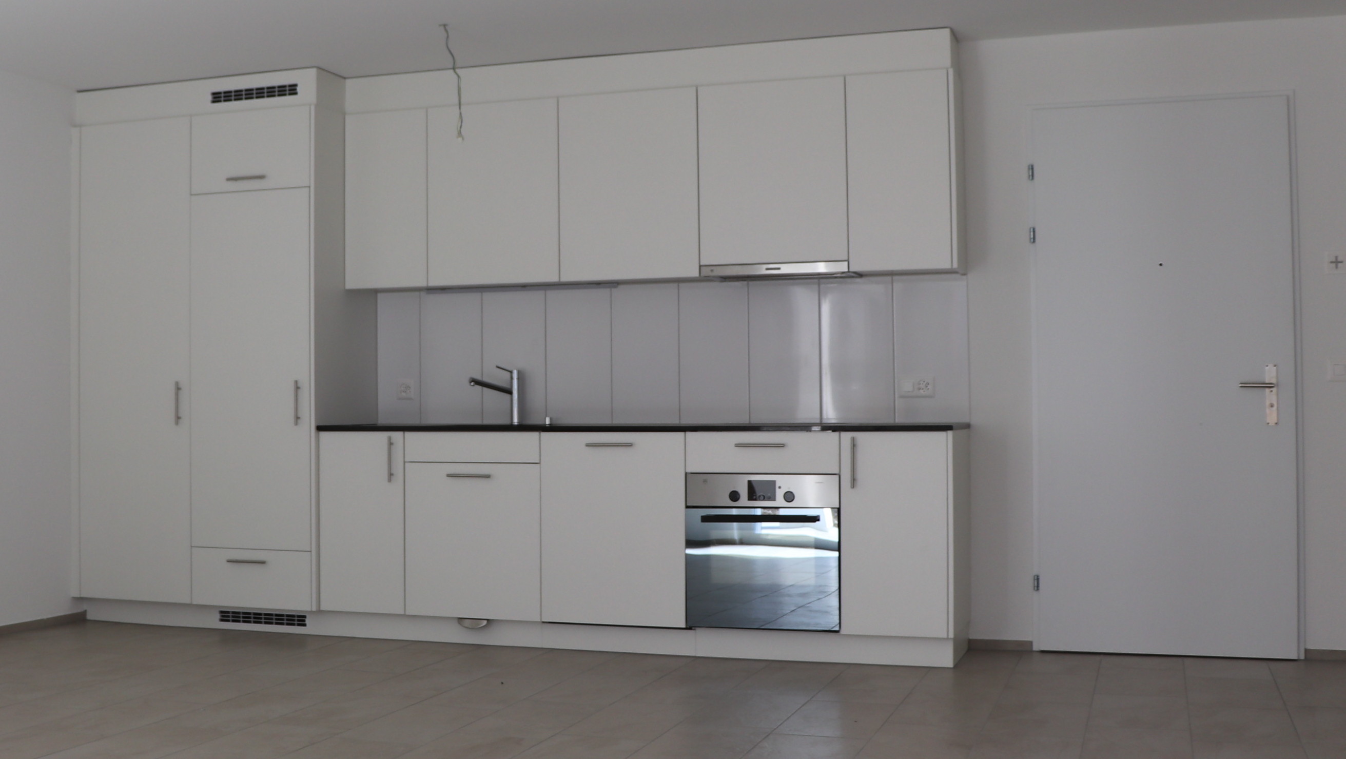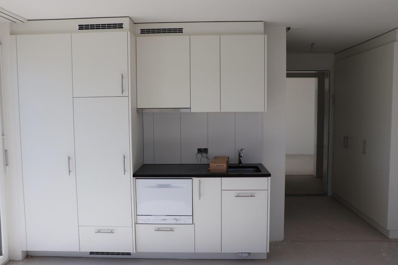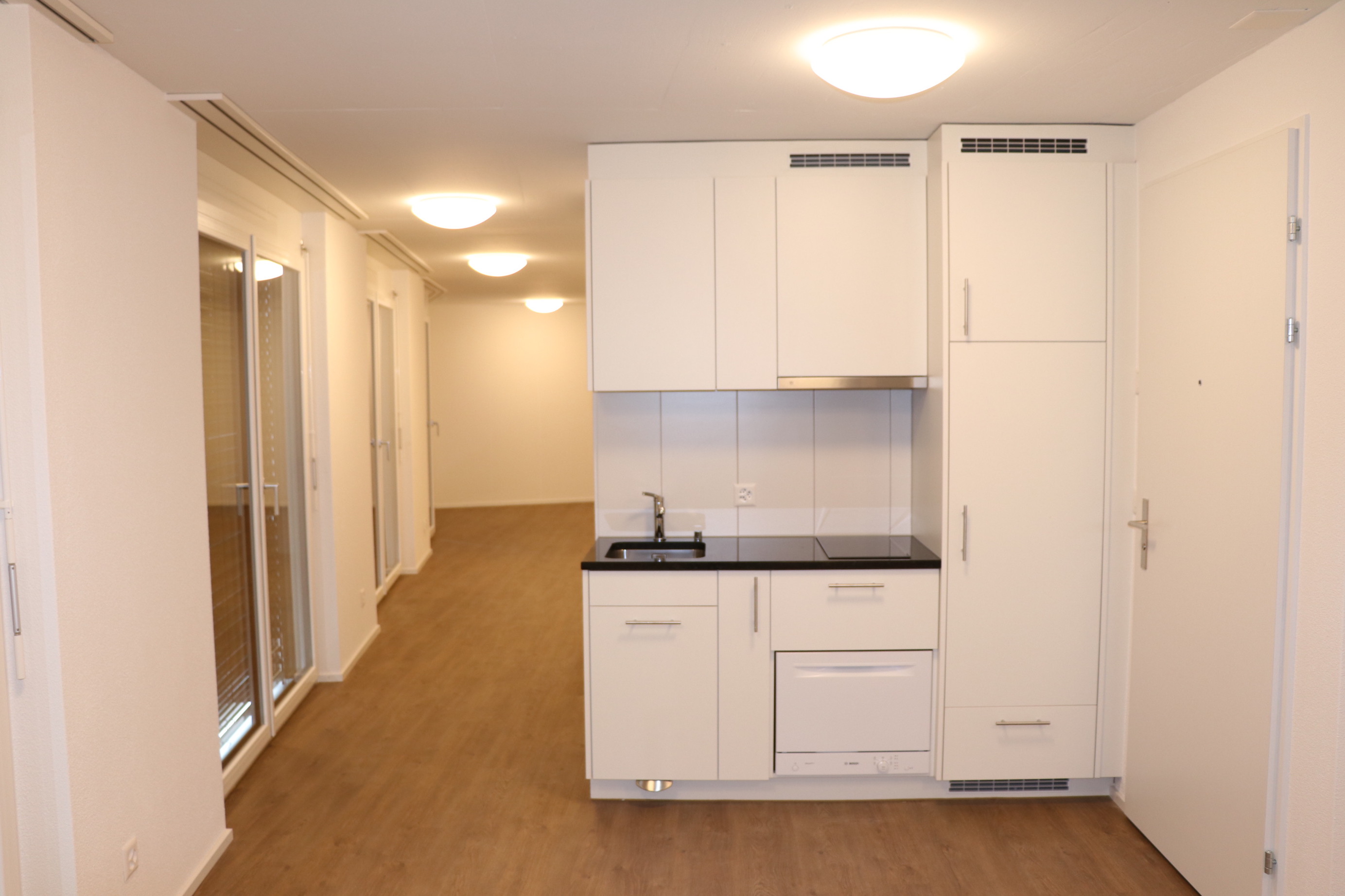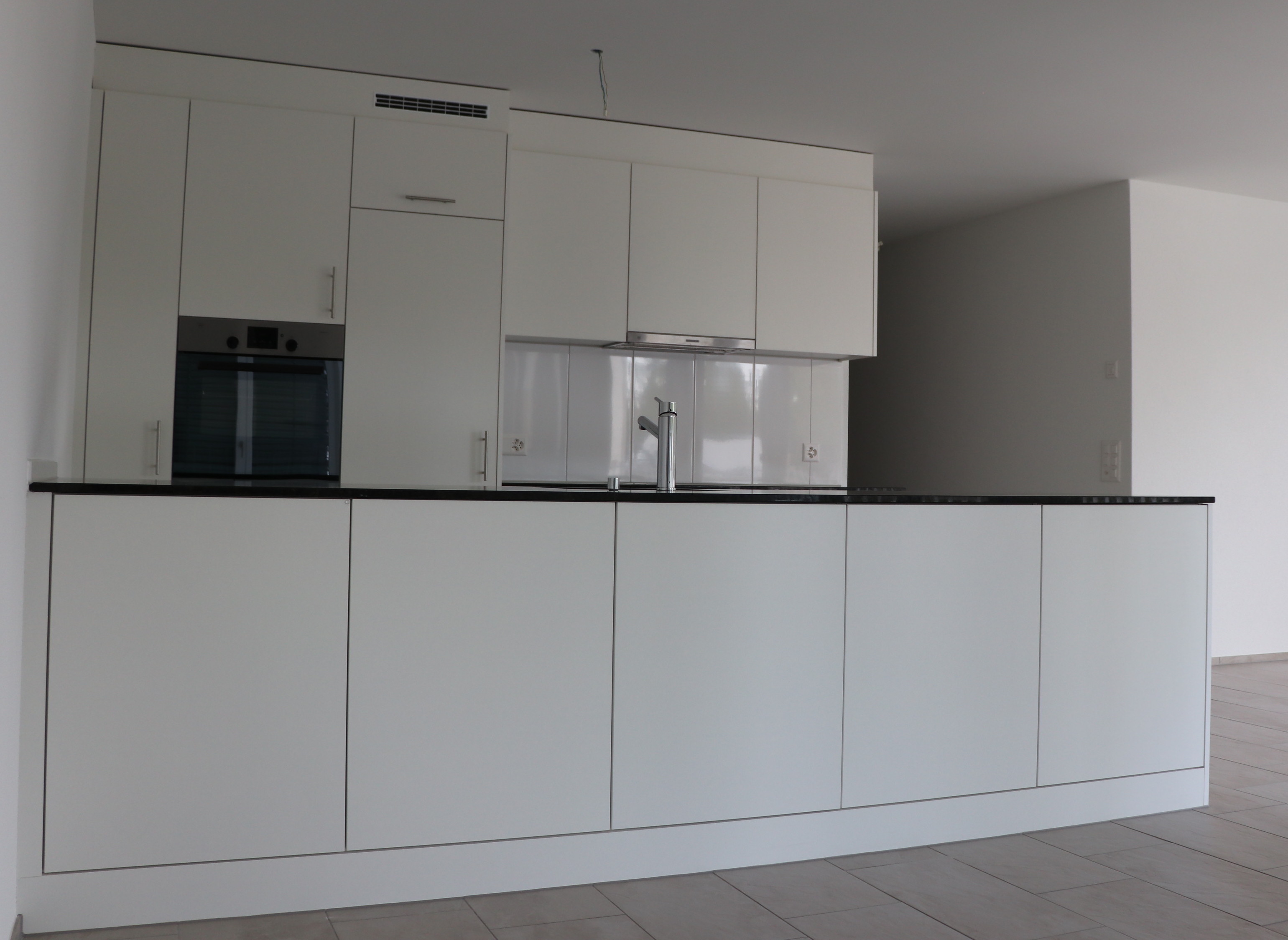 - Zeile3 Beschreibung: Blick in die neue Küche. Wo zuvor ein Waschbecken, Elektroherd und ein Tischchen stand, befindet sich nun eine topmoderne Küche mit Kochinsel und Steamer.