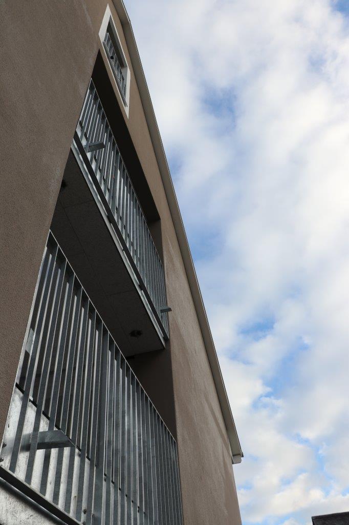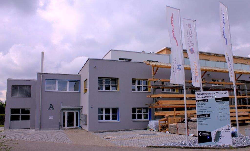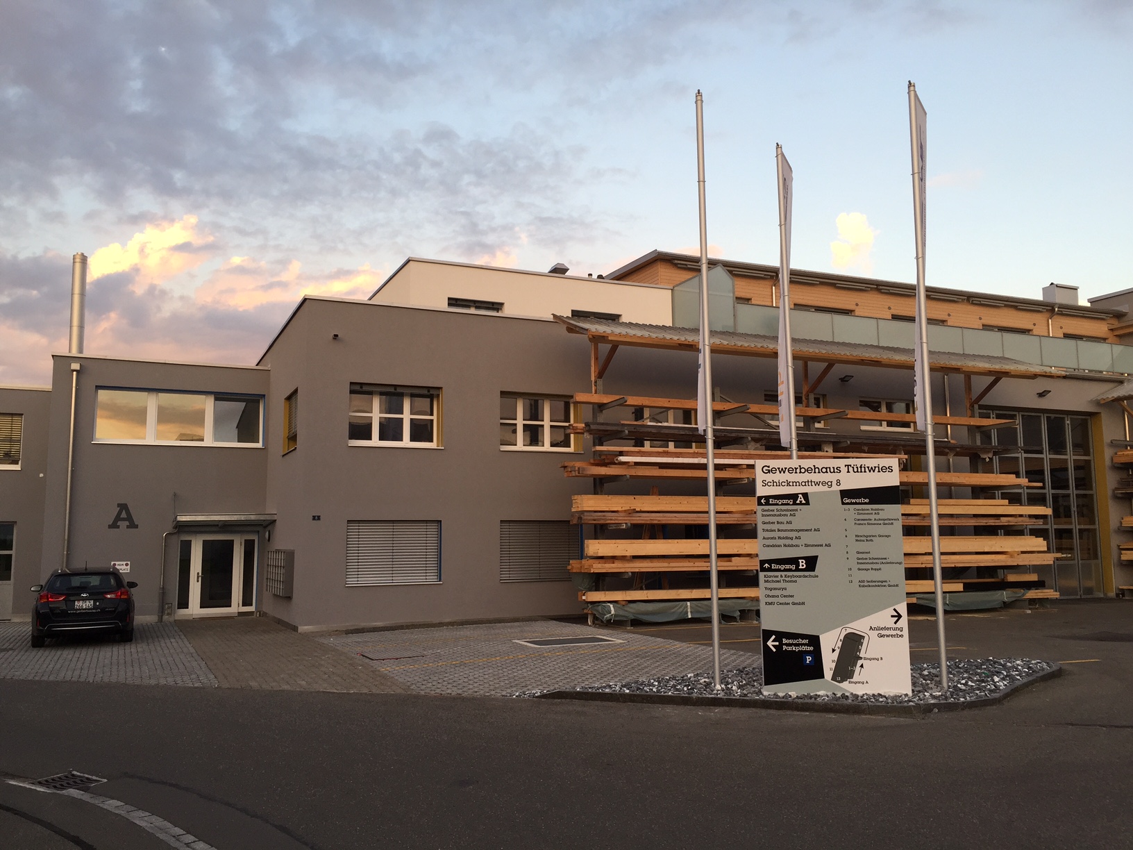 - Zeile3 Beschreibung: Auch die Nordseite der Gewerbeliegenschaft erstrahlt nun in neuem Glanz. Der Eingangsbereich ist freundlich und hell gestaltet. Die riesige Übersichtstafel weist den Weg zu den Unternehmen vor Ort.