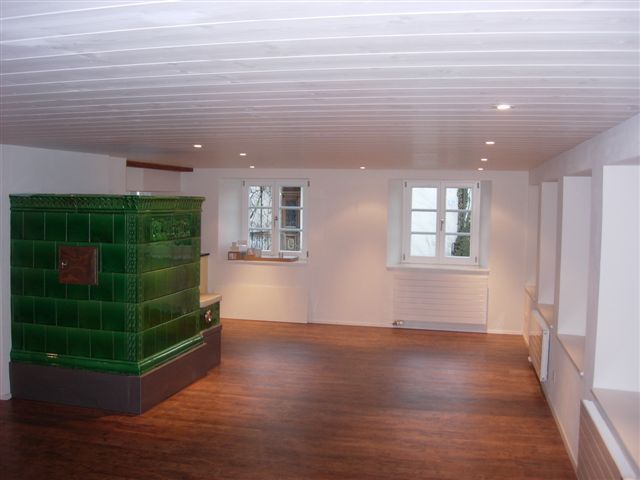 - Zeile2 Beschreibung: So präsentierte sich das Wohnzimmer mit dem Kachelofen. Das Objekt wurde bis auf die Tragkonstruktion ausgehölt, die Kellerdecke musste gedämmt, ausnivelliert und neu verkleidet werden. Die Zwischendecke wurde mit einem Lignatursystem erstellt werden. Die Holzdecke (hier mit eigebauten Spots) ist die ideale Lösung für eine Deckenkonstruktion bei engen Platzverhältnissen.