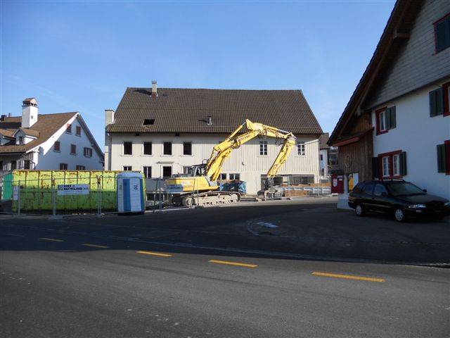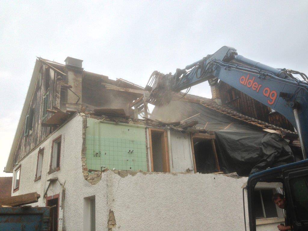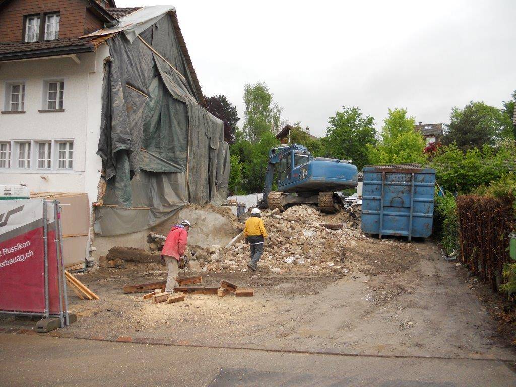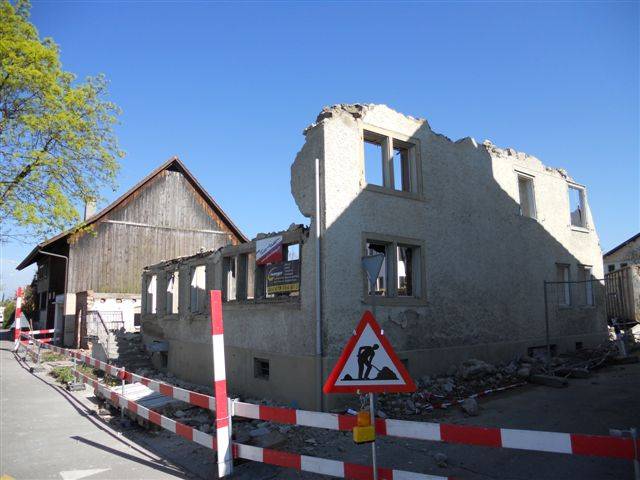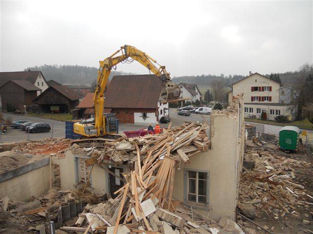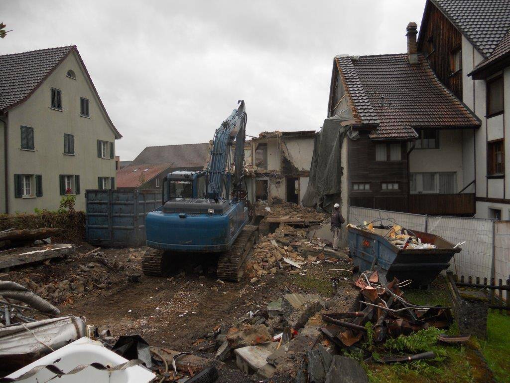 - Zeile2 Beschreibung: Muldenweise wurde Altholz, Alteisen und Bauschutt ausgebaut und abgeführt. Das Gebäude wurde durch den Zimmermann abgestützt respektive neu aufgestellt. Somit konnte das komplette Gebäude ausgehölt werden.