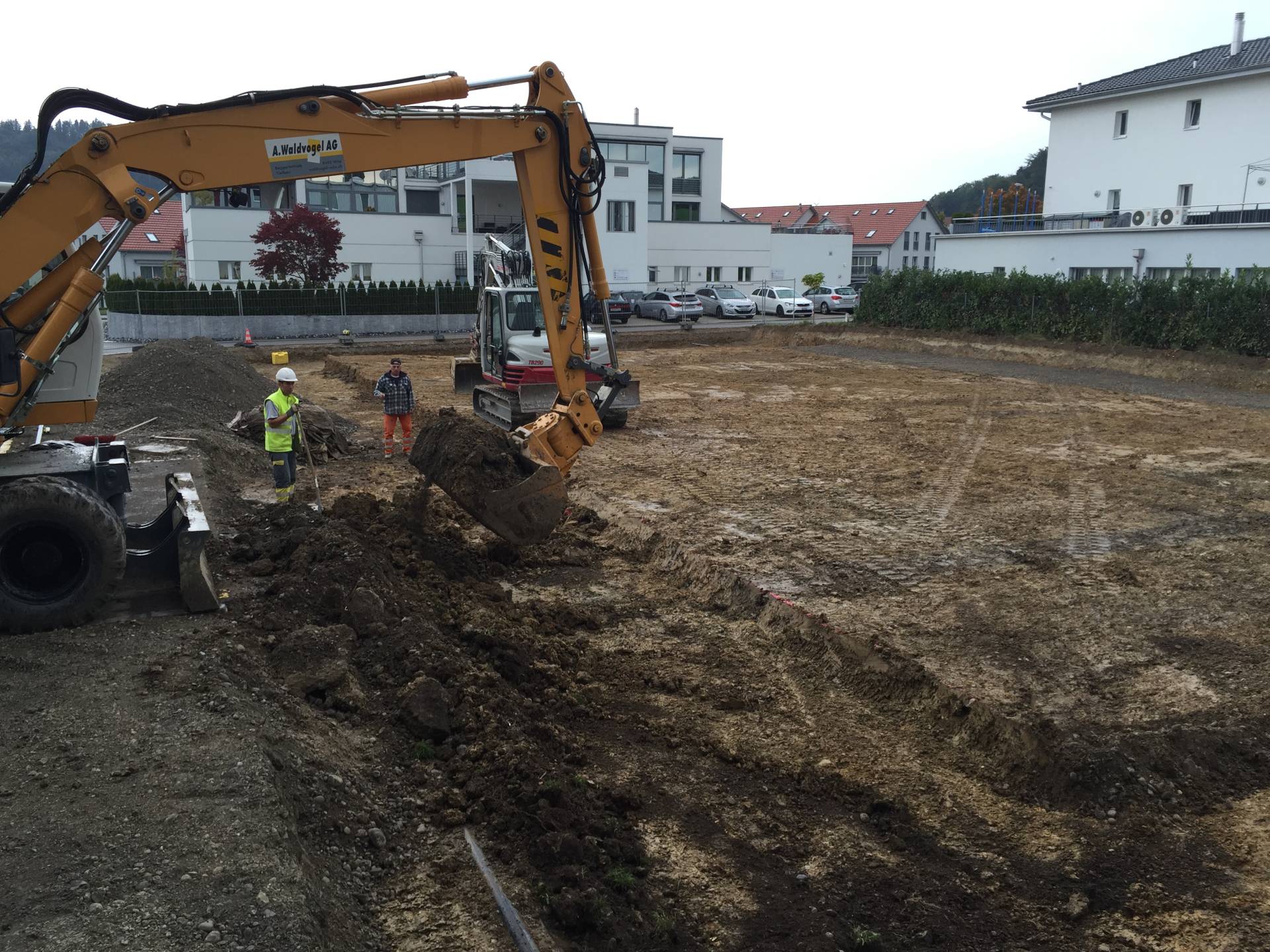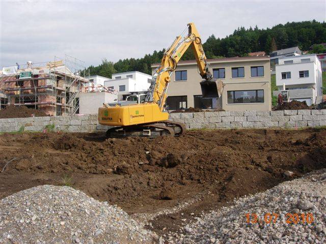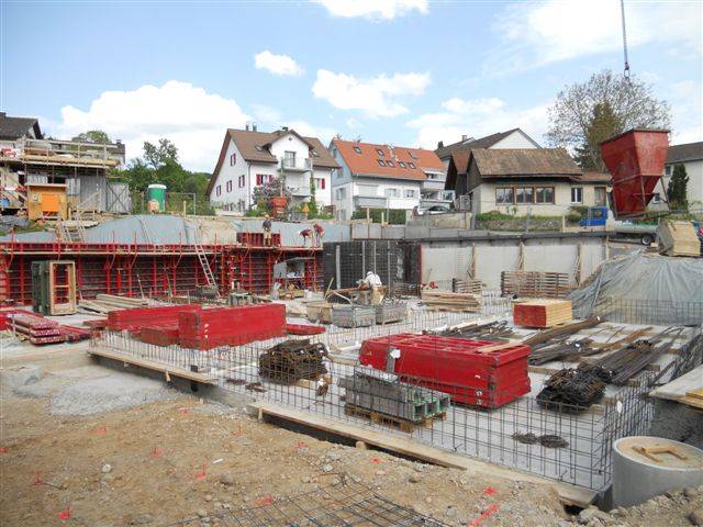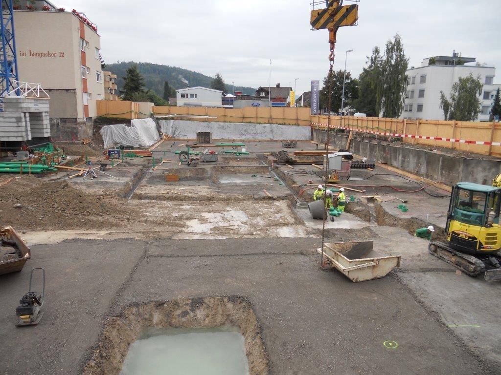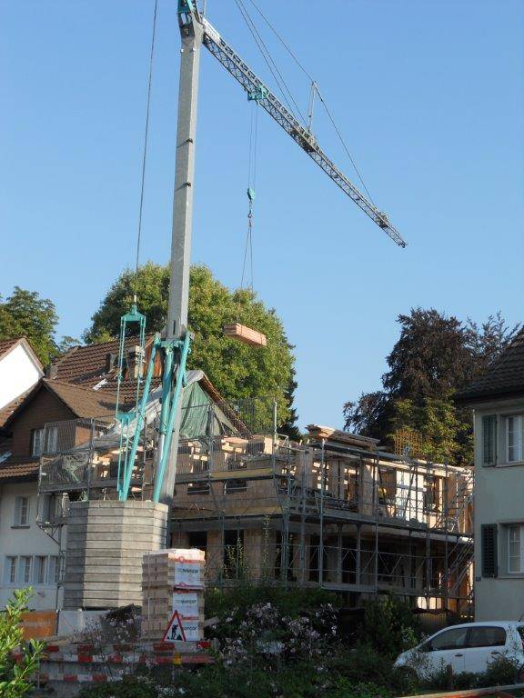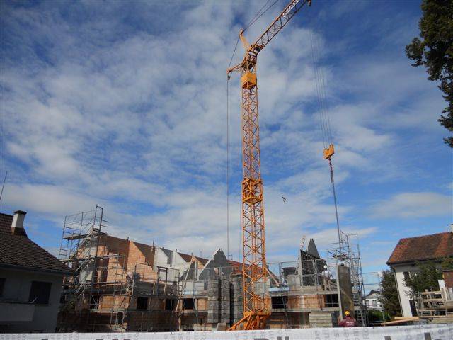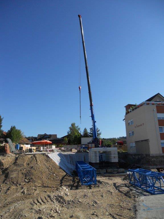 - Zeile2 Beschreibung: Hier sehen sie ein 44.50 m hohe Spezial-Pfählungsmaschine im vollen Einsatz. Das gesamte Gebäude musste auf Pfählen fundiert werden, da der Bodensee sehr nahe liegt. 18 Ortbetonpfähle und 89 Ortbeton-Verdrängungs-Pfähle mussten gebohrt werden damit das Gebäude danach auf einem echten Fundament zu stehen kommt.