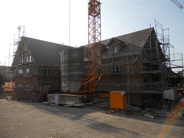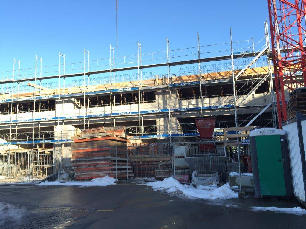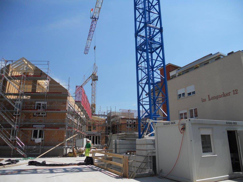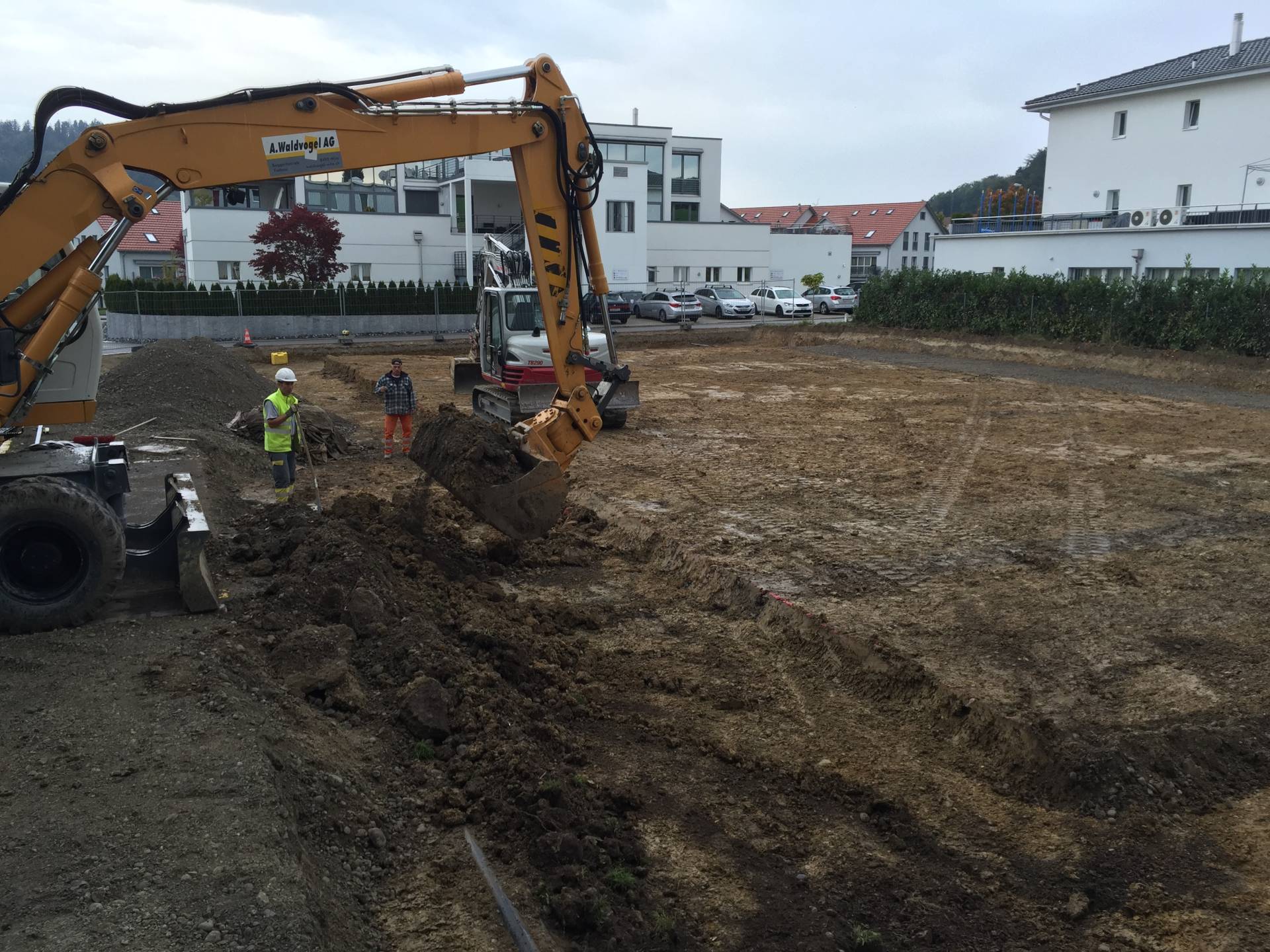 - Zeile2 Beschreibung: Hier sehen sie ein 44.50 m hohe Spezial-Pfählungsmaschine im vollen Einsatz. Das gesamte Gebäude musste auf Pfählen fundiert werden, da der Bodensee sehr nahe liegt. 18 Ortbetonpfähle und 89 Ortbeton-Verdrängungs-Pfähle mussten gebohrt werden damit das Gebäude danach auf einem echten Fundament zu stehen kommt.