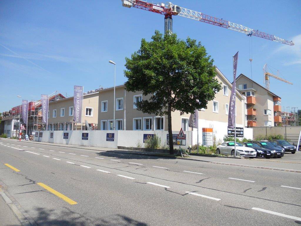 - Zeile1 Beschreibung: So präsentierte sich die Konstanzerstrasse 15 vor Baubeginn. Es war schlicht eine grüne Wiese. Nach Abschluss der Bautätigkeiten entstand hier ein modernes Hochhaus.