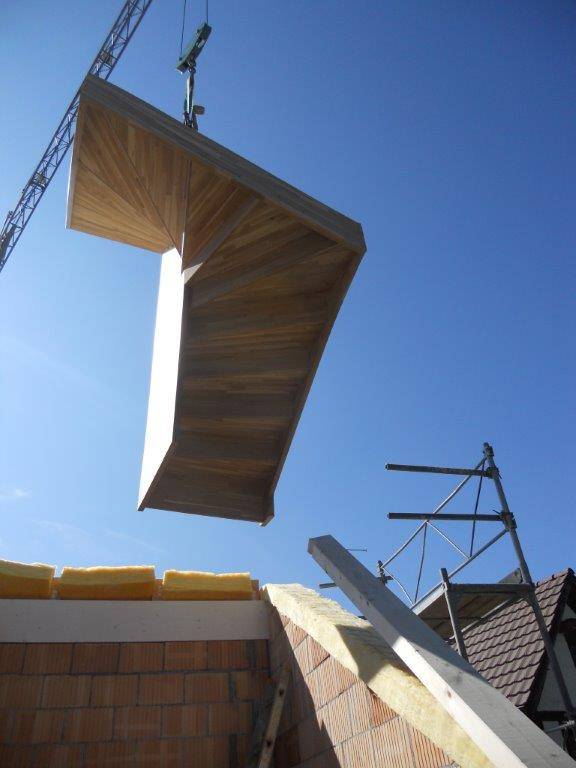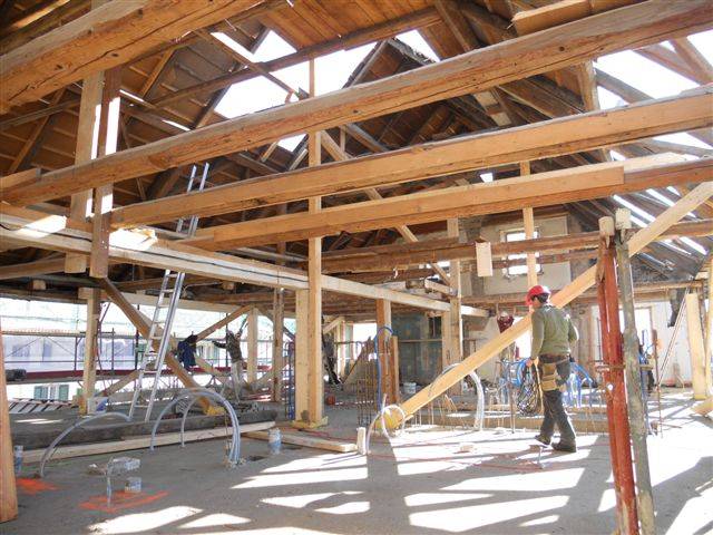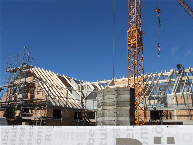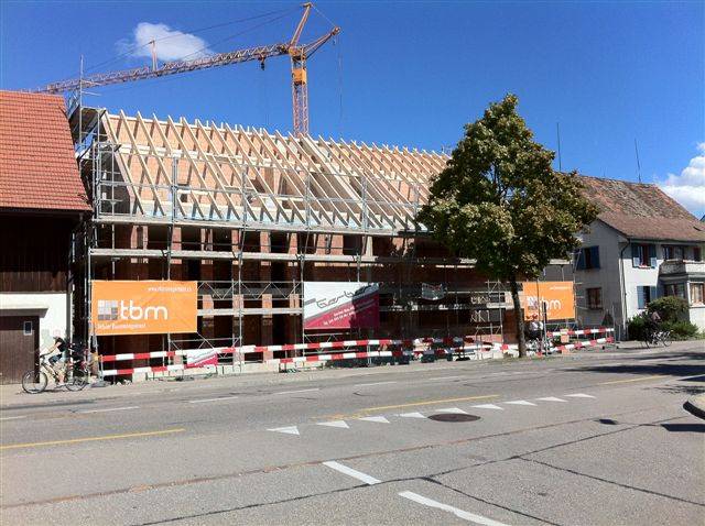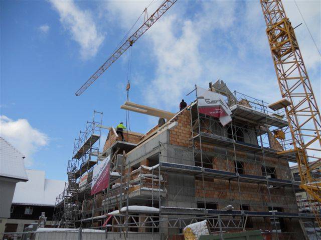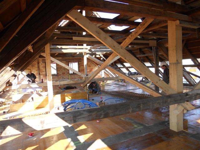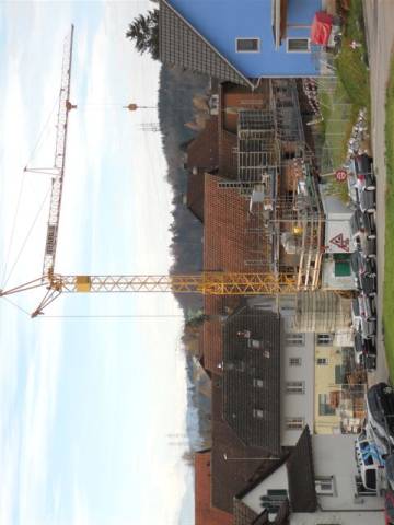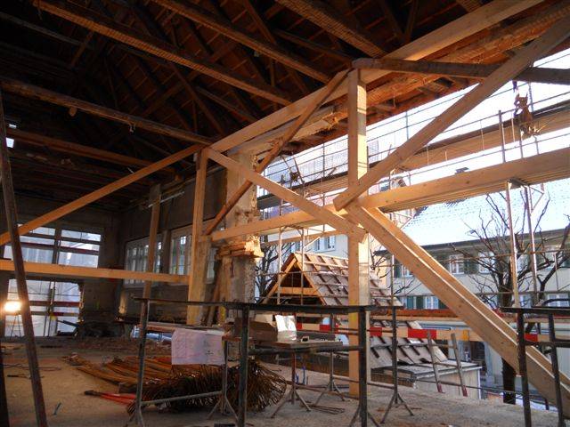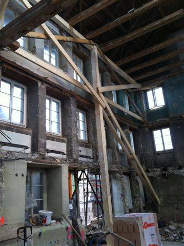 - Zeile3 Beschreibung: Der alte Dachstuhl wurde durch die gesamte Bauphase gesichert und abgestützt. Maurer und Zimmermann mussten im wahrsten Sinn des Wortes auf höchstem Niveau miteinander zusammenarbeiten.