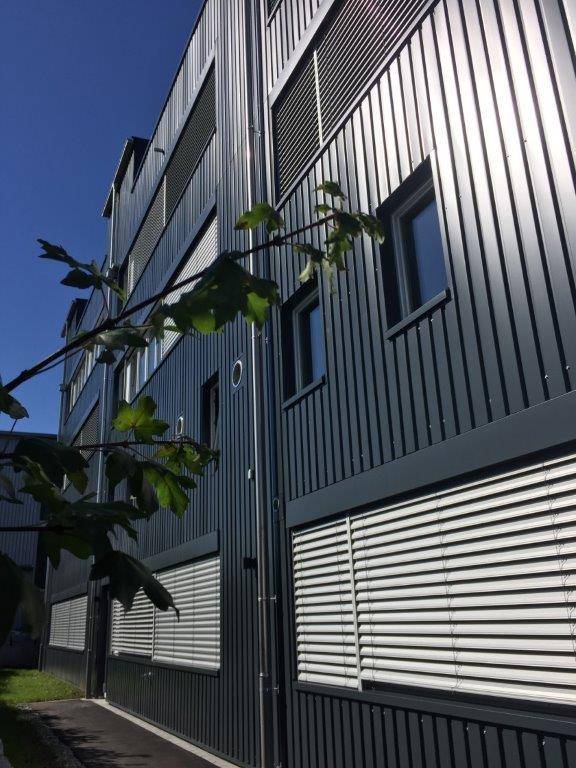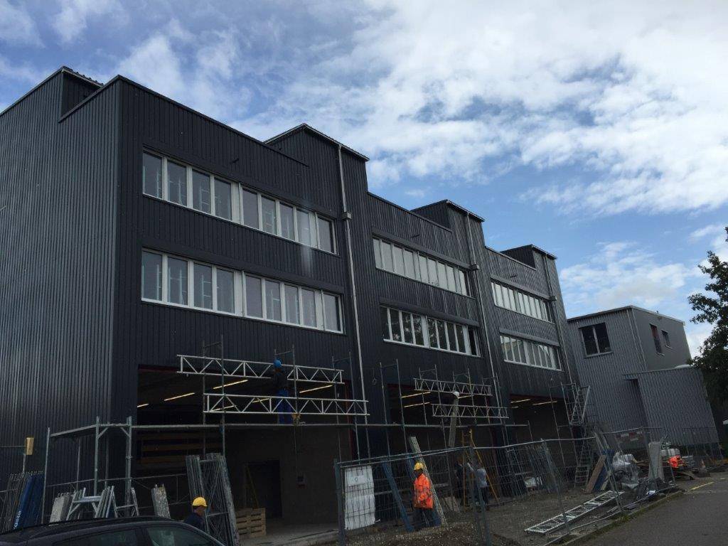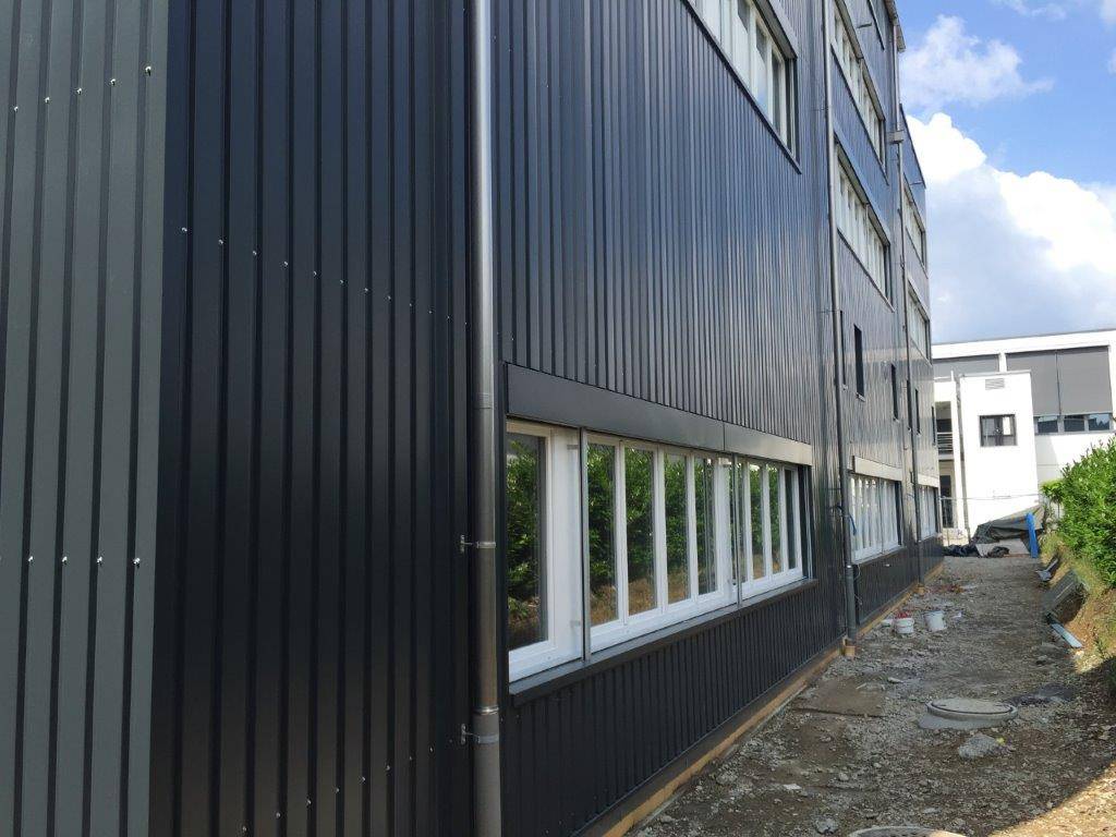 - Zeile3 Beschreibung: Auch die Nordseite der Gewerbeliegenschaft erstrahlt nun in neuem Glanz. Der Eingangsbereich ist freundlich und hell gestaltet. Die riesige Übersichtstafel weist den Weg zu den Unternehmen vor Ort.